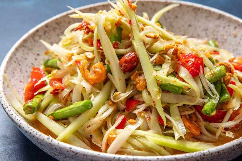 Som Tum, or Thai green papaya salad, is a refreshing and spicy dish that’s a favorite among locals and tourists alike. Made with shredded green papaya, tomatoes, peanuts, and dried shrimp, this dish is dressed with lime juice, fish sauce, and chili for a perfect balance of flavors. Pair it with sticky rice for an authentic Thai experience.